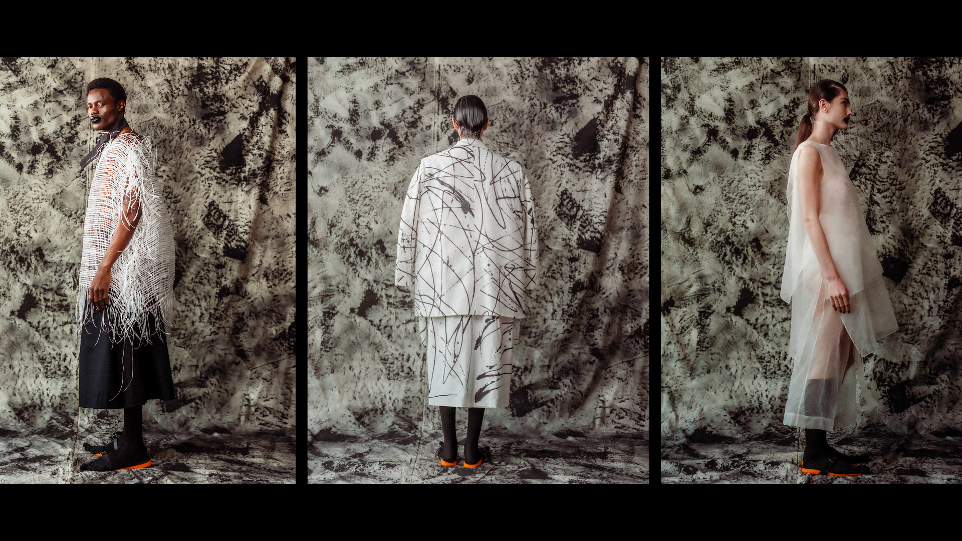 Tenho um processo gráfico de experimentações através da gravura, que aparecem às vezes num teaser do desfile ou num vídeo de processo de criação. Para cada coleção, para você ter uma ideia, eu geralmente realizo cerca de 800 croquis. É muita coisa. Fico dias elaborando enquanto faço a pesquisa de curadoria de resíduos têxteis. E isso tudo é bombardeado pelas leituras que faço. Antes, fazia paralelos com outros tipos de linguagem, filmes ou performances, por exemplo.